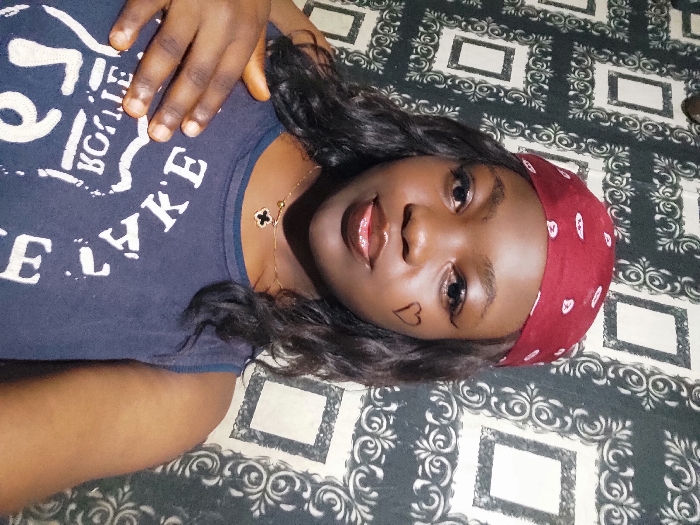 The image depicts an indoor portrait of a young adult female with dark skin and dark, wavy hair. She is wearing a dark red bandana patterned with white designs and a dark blue sleeveless top featuring distressed white lettering, partially legible as 'E.K.A.L.' and 'ROUTE'. A thin gold necklace with a black four-leaf clover pendant is visible. Her face shows defined eyebrows, winged eyeliner, glossy lips, and a small black heart drawn on her left cheek. Her right hand is placed across her chest, fingers splayed. The subject looks directly into the camera. The background is a wall covered with dark gray and white patterned wallpaper featuring repeating ornate rectangular frames and scrolled motifs. The precise location within Onitsha, Nigeria, cannot be ascertained from the visual information provided.