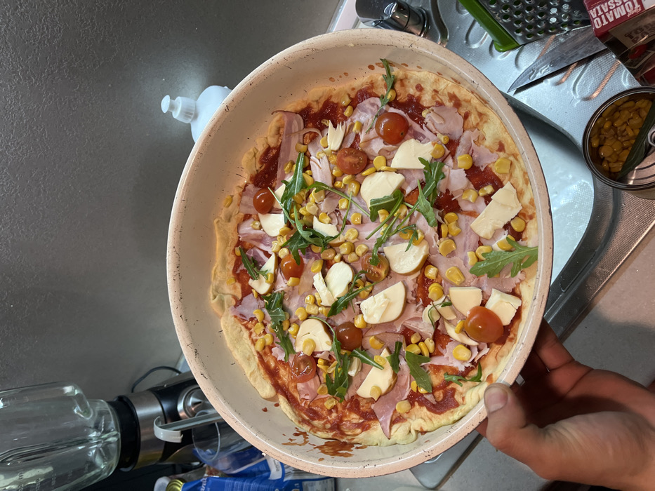 - "A human left hand holds a round, light-colored pizza pan containing an uncooked pizza" by FM-9LAWc2, licensed under CC BY 4.0