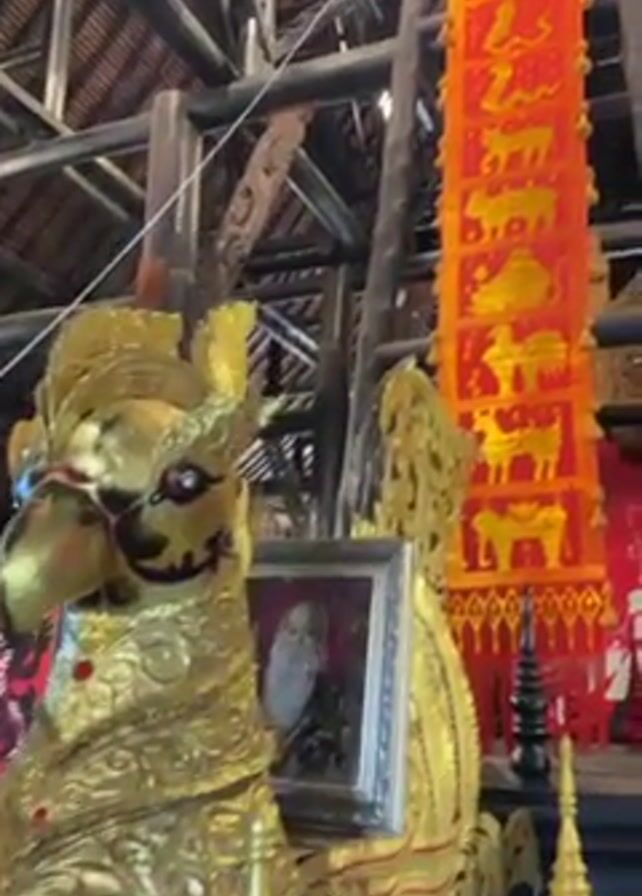 The camera pans up to show the interior of a large, wooden building. In the foreground is a golden, bird-like statue with intricate carvings, holding a framed portrait. Behind the statue, a tall, red banner hangs, adorned with golden animal figures. The building's wooden support structure is visible, with carved details and hanging banners in the background. The lighting is dim, with some bright spots.
