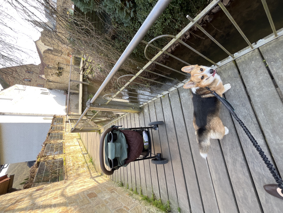 An outdoor scene in Meisenheim, Germany, depicts a narrow wooden walkway adjacent to a small stream. On the left, a tall stone wall with metal grating and overgrown vegetation rises. On the right, a metal railing with decorative arched supports separates the walkway from the stream below, which flows towards the background. Dense green foliage and bare branches line the stream's bank. In the foreground and midground, a tri-color Pembroke Welsh Corgi dog is positioned on the wooden walkway, facing the camera with its tongue slightly extended. It wears a harness from which a black and white braided leash extends towards the bottom left corner of the frame, where a human foot in a dark, flat shoe is partially visible, holding the leash. Further up the walkway, behind the dog, a dark-framed stroller with a green upper compartment and brown quilted lower section is stationary. It features cup holders on its handle. In the background, beyond the stream and railing, historical stone structures are visible, including a prominent, ivy-covered tower-like building with partial ruins. A white building stands to the left of these ruins, and a wooden bridge crosses the stream further in the distance. The scene is illuminated by natural sunlight, casting shadows.