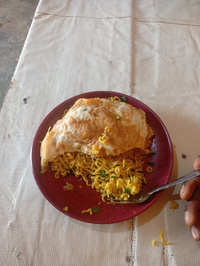 - "A red plate containing cooked noodles and a fried egg sits on a textured tablecloth" by FM-a7CDG3, licensed under CC BY 4.0