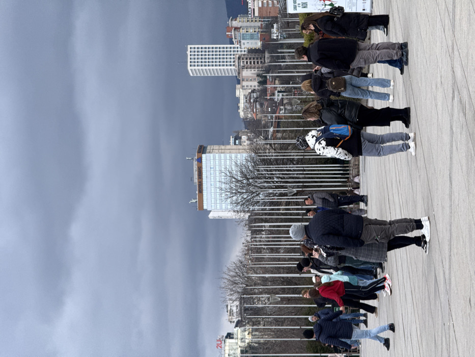 The image displays an outdoor urban environment on an overcast day in Sofia, Bulgaria, situated in the vicinity of the National Palace of Culture (NDK). The foreground consists of a wide, light grey paved plaza populated by approximately 20-30 individuals, predominantly adults and young adults. They are casually dressed in winter or transitional attire, including jackets, coats, jeans, and beanies. Individuals are observed standing and walking in various directions, with no singular coordinated action apparent. In the mid-ground, a dense arrangement of numerous tall, slender, vertical white poles forms a backdrop behind the crowd. Beyond these poles, the cityscape unfolds, featuring various buildings. The most prominent structure is the Hotel Hemus, identifiable by its brown top section bearing "HOTEL HEMUS" lettering and light blue window facade, located in the mid-left. To the right of Hotel Hemus, a taller, slender white building with a grid of windows is visible. Other background buildings display partial signage, including "2U" on the far left, and "HOMETEX" and "EQ Dint." further right. A banner on the far right edge includes the text "SUNDAY HEROES" and "NDK." Bare deciduous trees are scattered among the urban structures. The sky is largely covered by dark grey, heavy clouds, and distant mountains are faintly discernible on the horizon to the far right.