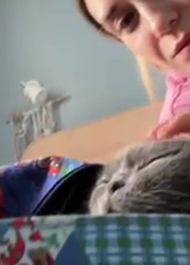 A young woman with blond hair pulled back is gently stroking a gray, Scottish Fold cat with her right hand. The cat is lying inside a brightly colored bag with a zippered top. The woman is wearing a pink t-shirt. The background shows a light blue wall, a wooden headboard, and a small decorative object hanging on the wall. The video appears to be shot from a close-up angle. The woman is looking at the cat, seemingly affectionate.