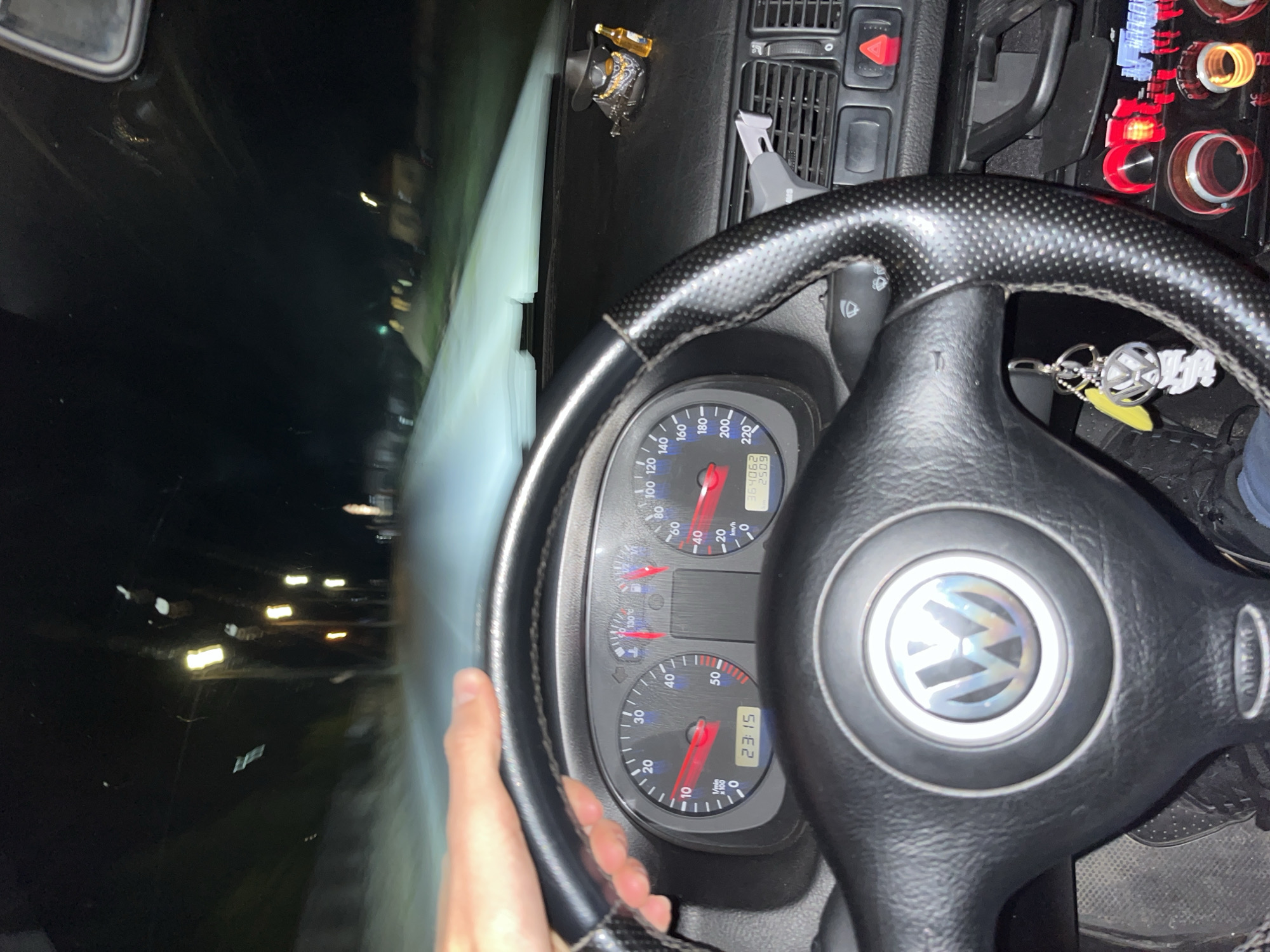 Here is a description of the image: The image is taken from inside a car, behind the steering wheel. The steering wheel is black with a silver Volkswagen logo in the center. The dashboard is visible, showing a speedometer and tachometer. The speedometer reads slightly above 0 km/h, while the tachometer reads around 23:15. Outside the driver's side window, there are blurred lights suggesting motion at night. There is a hand holding the bottom left of the steering wheel. A small accessory (cowboy hat with a bottle) is attached to the dashboard above the steering wheel. The red hazard light button and other car controls are visible to the right of the steering wheel. The location is not discernible as being the city of Moskovets in Bulgaria.