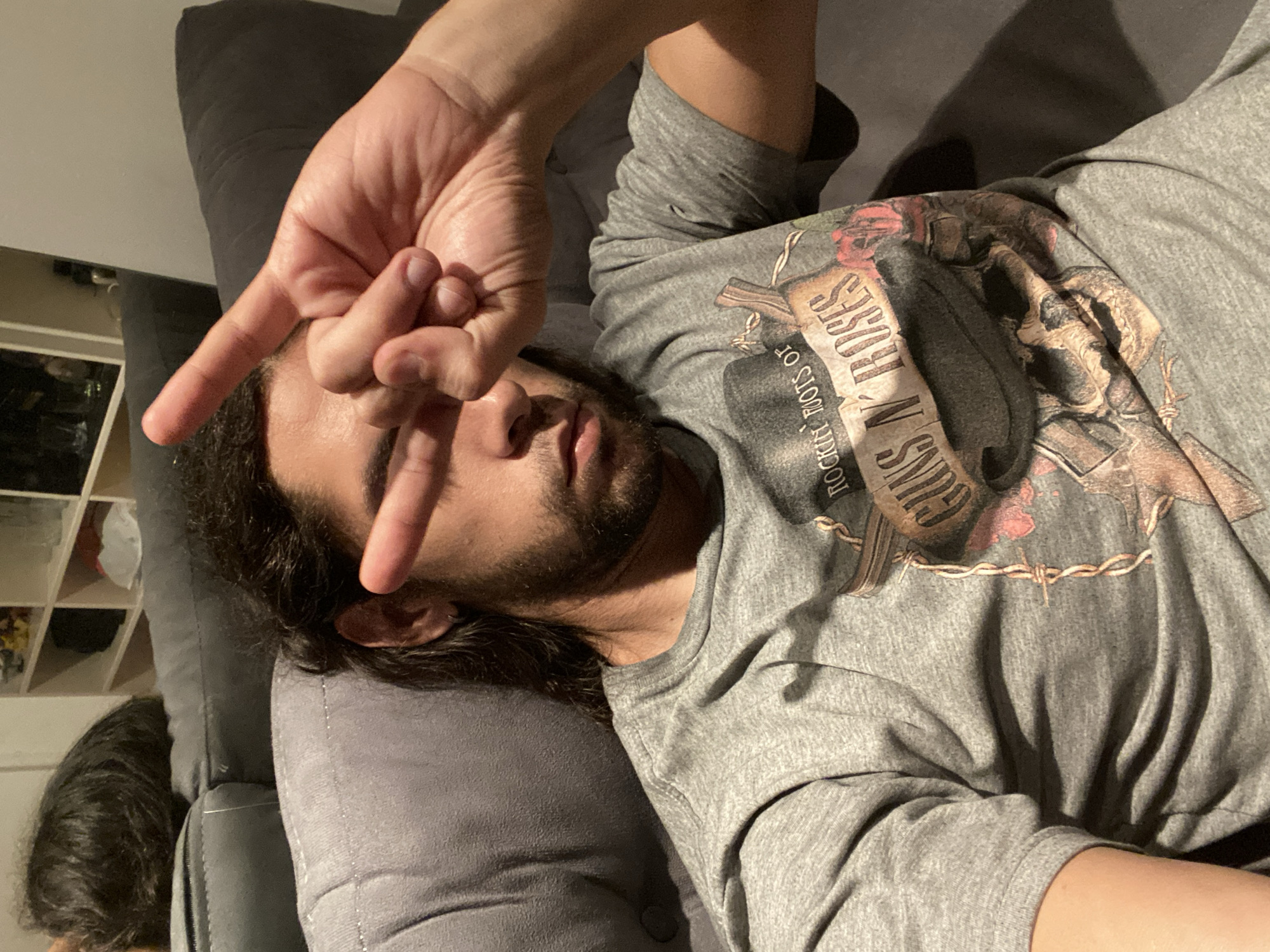 A person is lying on a gray couch, wearing a gray long-sleeved t-shirt with a faded Guns N' Roses graphic. The person has dark hair and a beard, and is holding a hand up with two fingers extended. The location is not possible to determine from the image.
