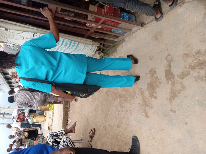 The image presents an outdoor market scene in Ura Nta Umuarandu, Nigeria. The foreground consists of an unpaved, light brown ground surface exhibiting irregular darker, damp patches. In the immediate foreground, a person faces away from the camera, wearing a full set of turquoise medical scrubs, including a short-sleeved top and trousers, paired with black flat shoes. Their hair is braided, and a black shoulder bag is slung over their left shoulder. Their right hand rests on a reddish-brown metal gate or barrier, likely belonging to a shop entrance. To the left, a portion of an individual wearing a blue shirt and black shoes is visible. To the right, the lower legs of another person are visible, wearing dark trousers and black flip-flops. The midground includes a person seated barefoot on a white plastic stool, dressed in black and white patterned trousers, with brown sandals placed on the ground nearby. Further back, multiple individuals are present: one person in a brown striped shirt and shorts walks away, while another individual in a white collared shirt and dark trousers stands. Market activity is suggested by a colorful umbrella, yellow sacks on the ground, and a pile of green fruit, possibly limes. The background features a multi-story building with a light-colored facade on the right. Utility poles and overhead wires are visible in the upper left. Adjacent to the metal gate, a shopfront displays bottled water and a partially visible white sack with black text. Numerous other individuals are present further down the street.