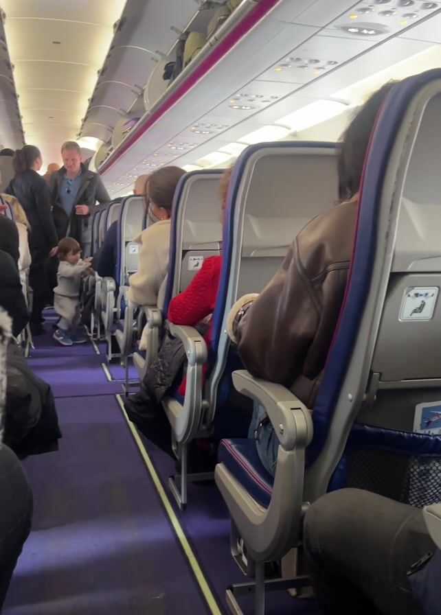 Inside the cabin of a passenger airplane, people are standing in the aisle, while others are seated. A man in a black jacket walks down the aisle carrying a small child dressed in grey. Passengers are seated on both sides of the aisle, in blue and white chairs. The floor is covered with a purple carpet. Overhead compartments are visible. The lighting inside the cabin is bright.