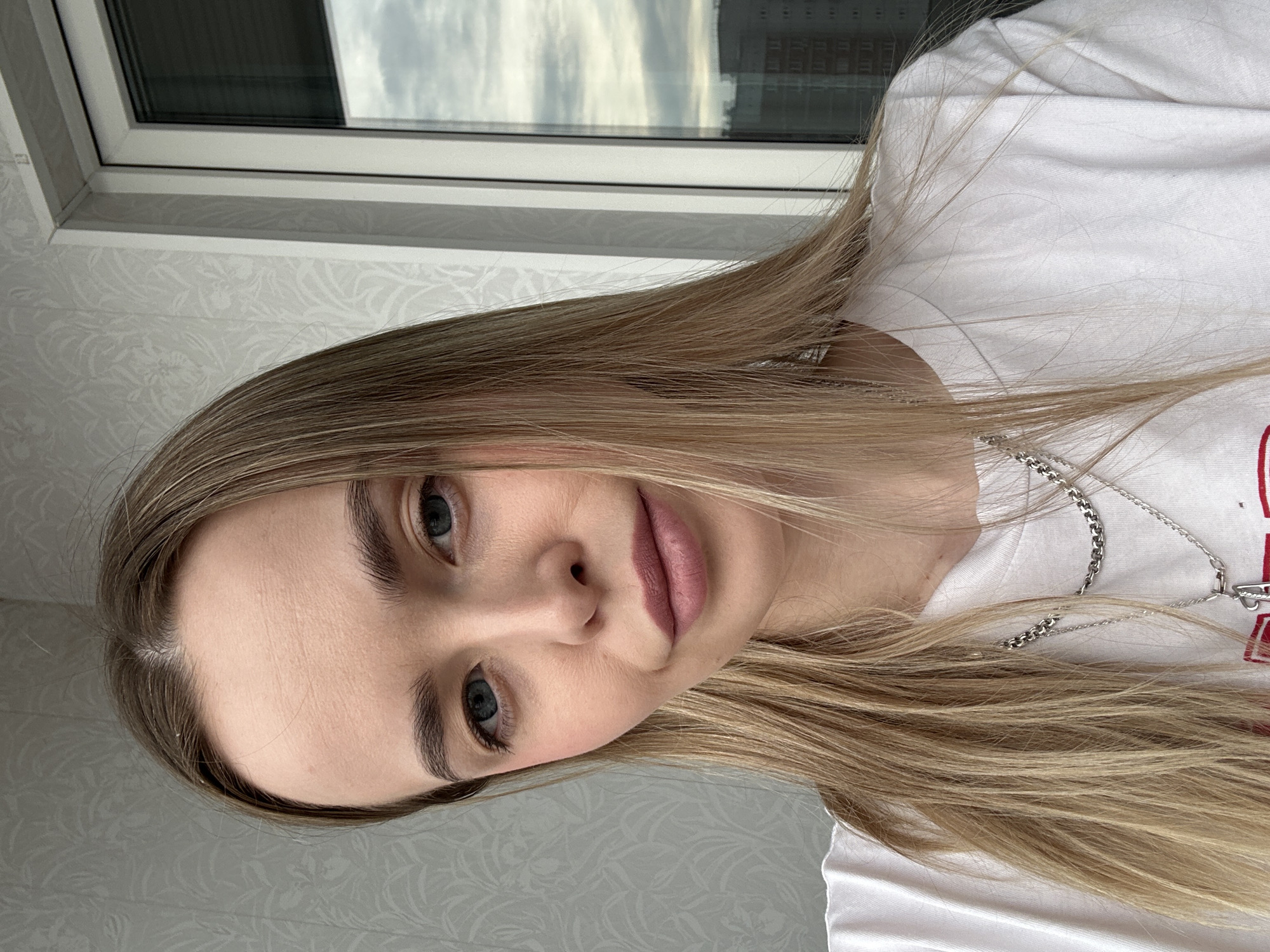 A woman with fair skin, light brown hair, and blue eyes is visible. She is wearing a white t-shirt and a silver chain necklace. The background includes a window with a view of a cloudy sky and a building reflecting in the glass. The location is the city of Chaikovsky, Russia. The wall is decorated with a light-colored patterned wallpaper.