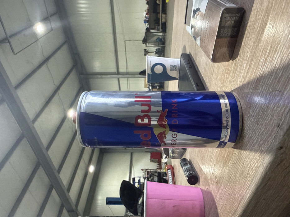The image displays a close-up view of various items arranged on a light-colored wooden surface, set within an indoor industrial workshop or garage environment. This location is presumed to be in Pazardzhik, Bulgaria. **Foreground Objects on the Wooden Surface:** - A prominent, upright, unopened Red Bull energy drink can occupies the central foreground. It is silver and blue, featuring the "Red Bull ENERGY DRINK" logo and Greek text reading "Αναζωογονεί σώμα και πνεύμα" (Invigorates body and mind). - To the left of the Red Bull can, from left to right: a pink disposable cup, a black cylindrical object (possibly a marker or small flashlight), and a small, irregular metallic piece. - To the right of the Red Bull can, from left to right: a black smartphone lying face down, a white paper cup with a blue circular design and a QR code, and a brown pack of Dunhill cigarettes, with a "US Warning" label visible on its side. **Background Environment:** - The background is blurred, indicating a spacious industrial interior. The ceiling features exposed metal structural beams and white, possibly insulated, panels. Multiple square LED light fixtures are visible, emitting bright light and causing lens flares. - On the far left, a vehicle with an open hood is partially visible next to a blue hydraulic lift. - Various indistinct tools, machinery, and workshop equipment are discernible throughout the background. - No individuals are present in the image. No actions or interactions are depicted.