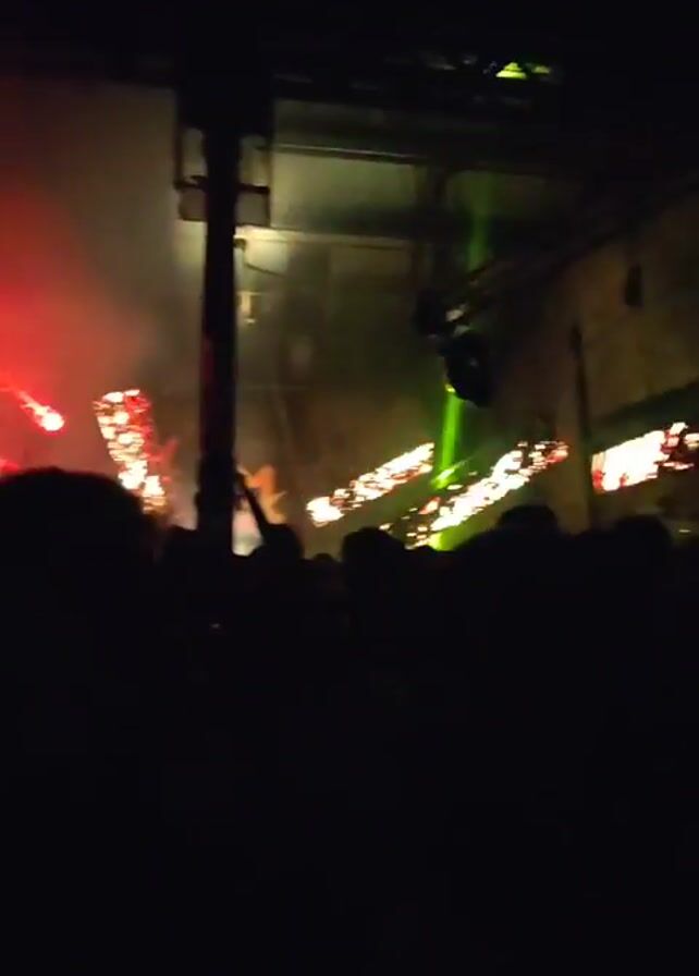 dark, crowded space that appears to be a music venue or concert. The crowd is mostly silhouetted, but some individuals are visible. Bright green spotlights move around the stage, and there are other lights that appear to be orange or red. The environment looks like an industrial space, with visible beams and ceiling structures. The audience seems to be enjoying the performance, with some raising their hands.