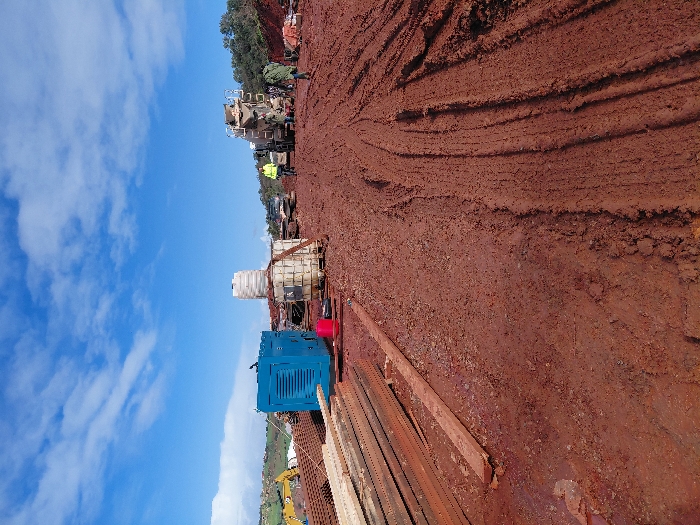 An outdoor, active construction site is depicted under a partly cloudy blue sky in Fdalate, Morocco. The ground is composed of reddish-brown mud and soil, marked with deep tire tracks running from the foreground into the mid-ground. In the left foreground, several bundles of wooden planks and rusted metal rods are stacked horizontally on the ground. Immediately behind these, a bright blue, enclosed industrial generator or machinery unit rests on the earth, with a red plastic bucket positioned in front of it. Further right and slightly behind the generator, multiple large, cylindrical white plastic containers, possibly intermediate bulk containers (IBCs), are visible on pallets. A tall, narrow white tank stands upright behind these containers. In the mid-ground, a white cement mixer truck is positioned to the right of the central path, its drum angled towards the right. Several individuals are present on the site. One person, wearing a bright yellow high-visibility jacket, walks towards the viewer from the mid-ground, slightly to the right of the central path. At least three other individuals, dressed in darker clothing, are grouped near the cement mixer truck. In the far background on the left, a yellow excavator is partially visible. The distant background reveals green-brown hills topped with sparse vegetation. The overall scene indicates ongoing work at a ground-level industrial or construction operation.