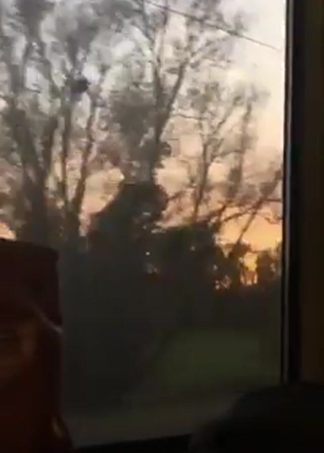 view from inside a moving vehicle, likely a train, looking out of a window. Outside, trees and vegetation are silhouetted against a sky with colors of sunset or sunrise, displaying light orange and pale blue hues. The view is somewhat obscured by the glass. Parts of seats are visible inside the vehicle, including a seatback that is orange. Overhead power lines are also visible through the window.