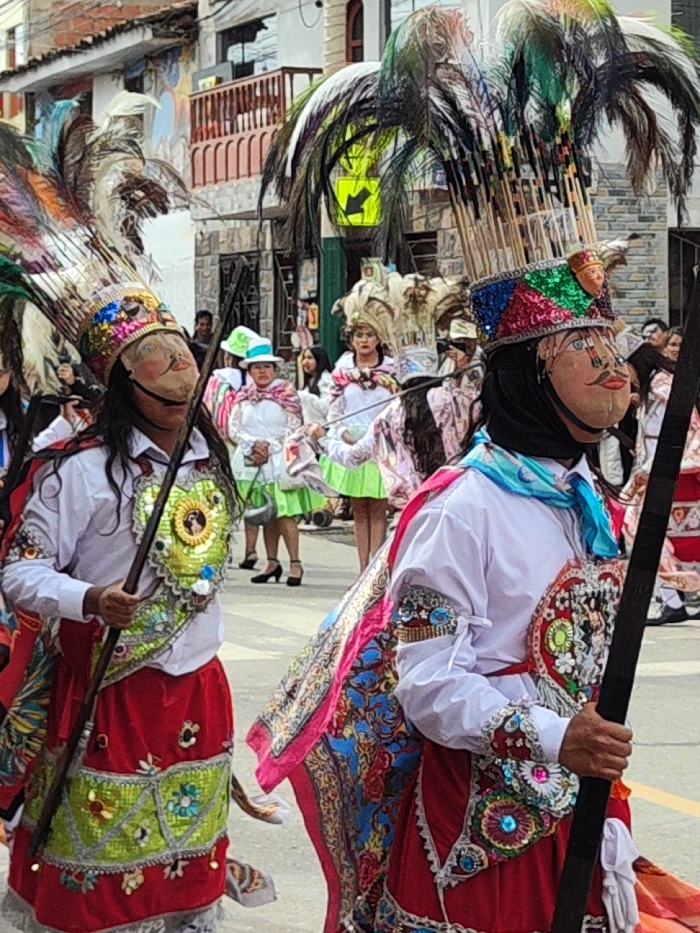 Two people in vibrant traditional attire, including ornate headdresses with feathers and painted masks, carry wooden staffs during an outdoor celebration. Their costumes feature bright red skirts, white shirts, and decorative sashes. Behind them, a crowd of people is also participating in the event. Buildings and street lamps are visible in the background, suggesting an urban or town setting.