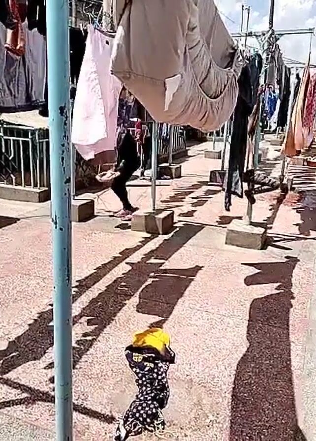The video depicts an outdoor scene with clotheslines strung between metal poles