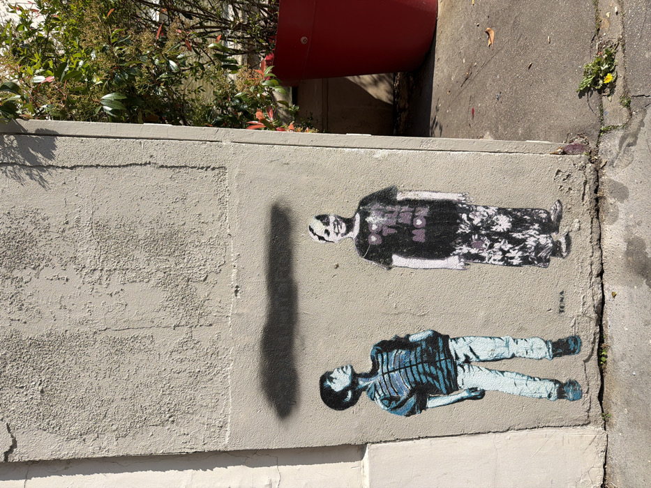 - "A street art stencil featuring two children and a cloud is depicted on a light beige, textured stucco wall in Paris, France" by FM-aXd4u1, licensed under CC BY 4.0