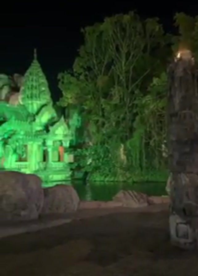 building illuminated by green lights, resembling an Asian temple, at night. The temple is surrounded by a body of water and rocks. There is a large pillar with a flame on top. Statues of elephants and dragons are visible, and the scene is set against a backdrop of trees. The video also captures the ambient sounds of drums.