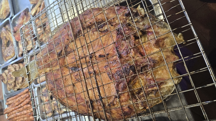 - "The image displays a close-up, slightly overhead view of a large, flattened, whole grilled fish, likely a carp, secured within a rectangular metal grilling basket" by FM-SeWPA2, licensed under CC BY 4.0