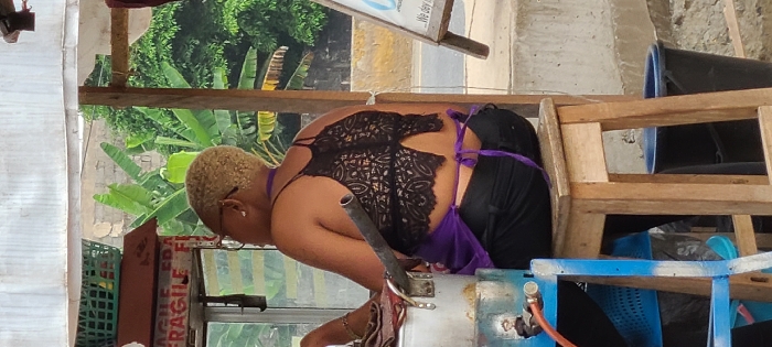 - "This image presents a rear-view, medium shot of a woman seated at an outdoor vendor stall in Aba, Nigeria" by FM-wtrFy1, licensed under CC BY 4.0