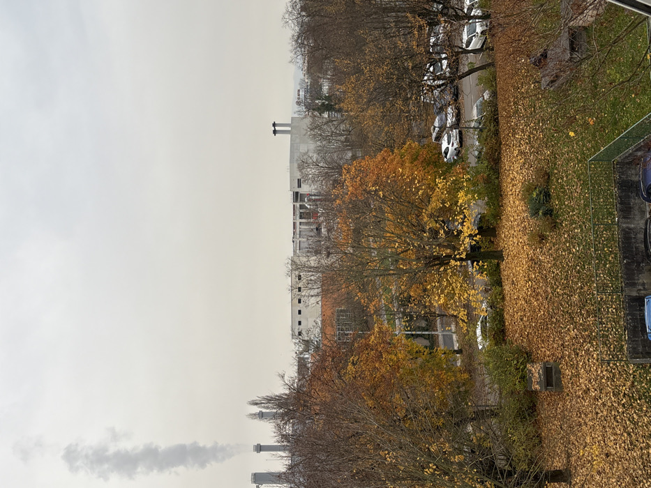 This image depicts an elevated view of an urban landscape in Strasbourg, France, specifically looking towards the Port du Rhin area during late autumn. The sky is uniformly overcast and light grey. In the immediate foreground, a concrete barrier partially obscures the top portions of several parked vehicles. Above this, a green metal fence runs horizontally. The ground immediately beyond the fence is a grassy area heavily covered with fallen brown and yellow deciduous leaves, with a dark grey rectangular utility box or planter visible on the left. The midground features numerous deciduous trees displaying vibrant yellow, orange, and brown autumnal foliage, while some trees are mostly bare. A paved road or street runs through this section, with multiple cars (white, silver, and dark-colored) parked along both sides. The background is dominated by industrial structures. On the far left, a cluster of industrial chimneys belonging to the Électricité de Strasbourg (ÉS) thermal power plant is visible, with one chimney actively emitting a tall, vertical plume of grey smoke. To the right of these, a large, multi-story industrial building with a light-colored facade and visible roof infrastructure extends horizontally. Further to the right, behind this structure, two prominent, dark grey cylindrical stacks are visible, indicative of the Strasbourg Incinerator (UVE). The distant horizon shows faint outlines of other buildings and structures. No people are visible.