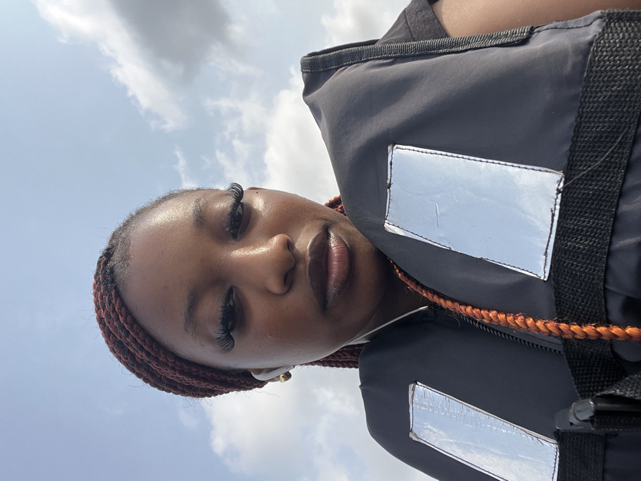 An upward-angled, close-up outdoor photograph features a young Black female, observed from the chest up, under a cloudy sky in the city of Ado, Nigeria. She has reddish-brown braided hair, prominent eyelashes, and a neutral facial expression, looking directly at the camera. A white earbud is visible in her left ear, along with a small gold stud earring. She is wearing a dark, likely black, zipped life vest with two rectangular silver reflective patches on the chest area, one on each side. A dark t-shirt is visible beneath the life vest on her right shoulder. The background consists of a pale blue sky with scattered white clouds.