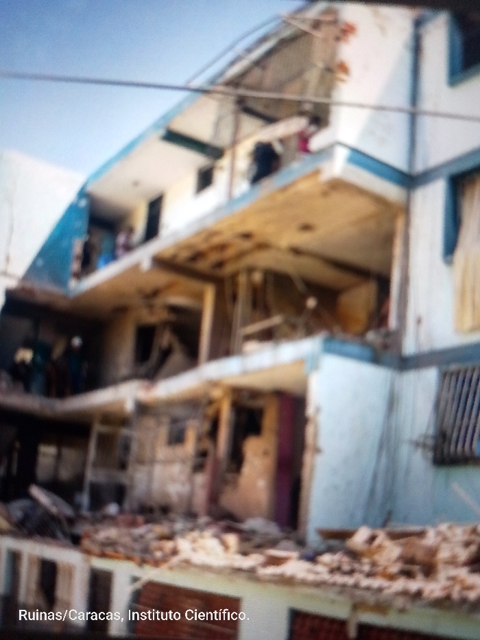 A partially collapsed multi-story building is shown with significant structural damage. Debris litters the foreground. Several floors have crumbled, exposing the interior. Figures are visible on the remaining parts of the building. The structure appears to be made of concrete and has some blue accents. The text at the bottom reads "Ruinas/Caracas, Instituto Cientifico," indicating the location as Caracas and potentially identifying the damaged building as a scientific institute.