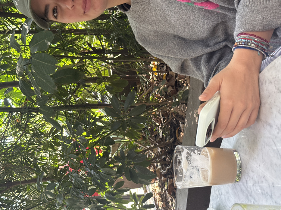A person with a gray sweater and green hat sits at a table. They hold a white smartphone in their right hand. Multiple bracelets adorn their wrist. A half-empty glass of a creamy beverage sits on the table. Lush green foliage forms a backdrop with sunlight filtering through the leaves. The table has a marble pattern.