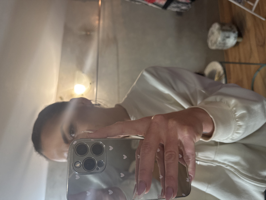 A female individual is depicted taking a mirror selfie in an indoor setting. She holds a silver-colored smartphone, likely an iPhone due to its triple-lens camera array, encased in a clear cover adorned with multiple small white hearts. Her right hand, featuring long, light-pink manicured nails, grips the phone. She wears a light-colored, possibly off-white or cream, collared sweatshirt with a zipper front. Her dark hair is pulled back. The background, visible in the mirror's reflection, shows two illuminated wall sconce lights, a patterned stool with short legs, a slender metal side table, and a portion of a red, black, and white patterned garment hanging on the far right. Light-colored wooden flooring is visible in the lower right. The specific location within Bar, Montenegro, cannot be determined from the visual information provided in the image.
