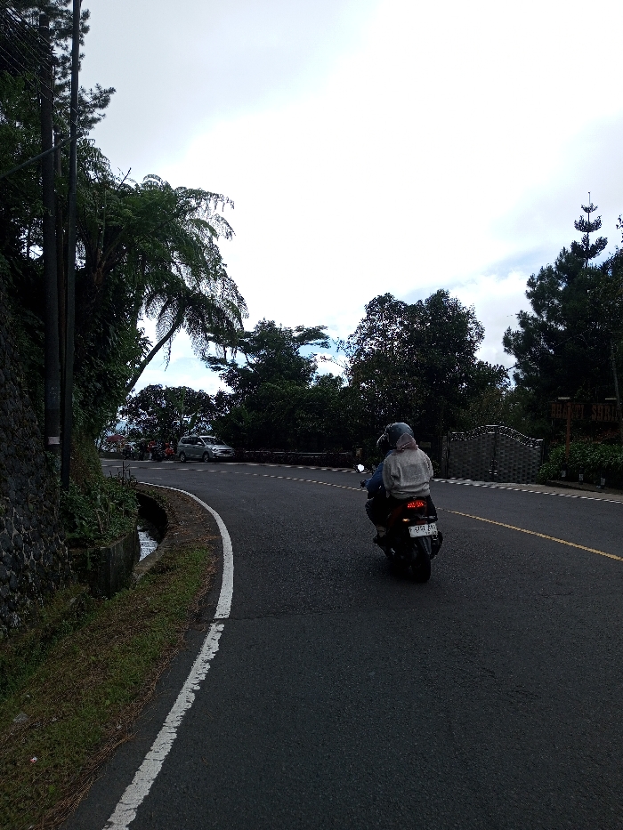 A paved, two-lane road curves right under an overcast sky. In the foreground, a black scooter with two riders travels away from the viewer. The driver wears a blue top and a light blue helmet. The passenger wears a light-colored top, a light-colored head covering, and a light blue helmet. The scooter displays a visible red taillight and an Indonesian license plate, "P 4751 ZAW," indicating the scene is not in Phoxay, Laos, but rather Indonesia. To the left, a stone retaining wall borders the road, topped with dense green foliage, including a large fern-like plant and multiple utility poles. A narrow concrete drainage ditch, partially filled with water, runs between the wall and the road's white edge line. Sparse grass grows along the ditch. To the right of the road, dense green trees and vegetation line the curve. Further along the road on the right, a silver SUV is visible. Beyond it, a dark metal gate and a wooden sign, possibly reading "BHAKTI SHRAM," are partially obscured by trees. The environment is lush with greenery, consistent with a tropical or sub-tropical region.