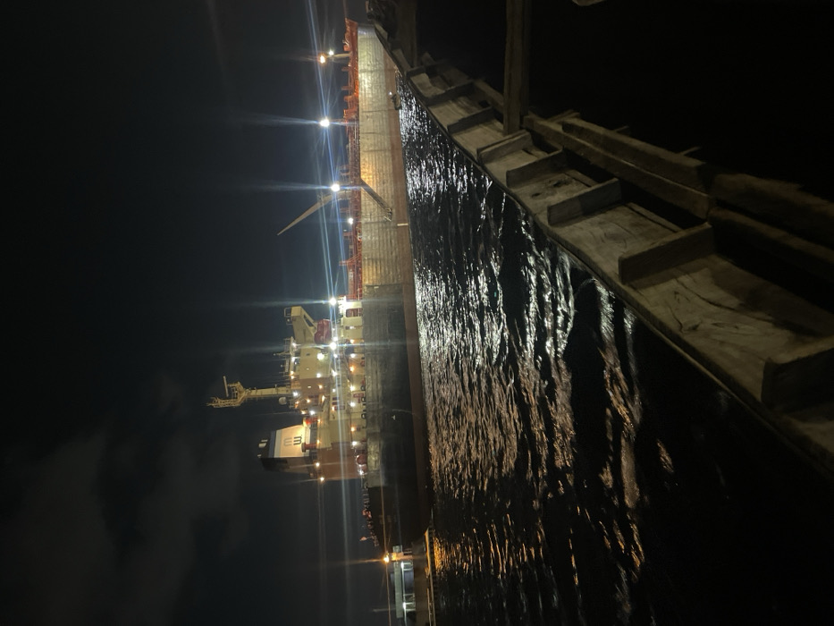 A ship is docked at night with bright lights illuminating its various levels. The water near the dock is dark and rippled, reflecting some of the light from the ship and nearby dock. Wooden structures extend into the water, possibly part of the dock itself. The night sky is dark, with a few hints of clouds near the horizon.