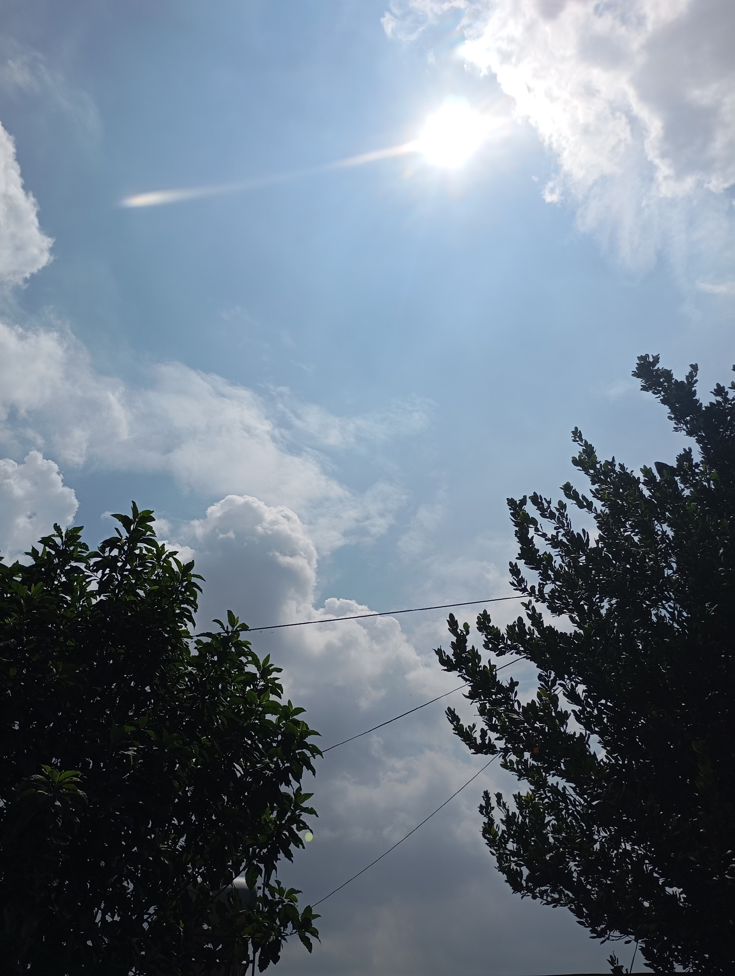 The image displays a daytime sky, likely over an urban or suburban area within Johannesburg, South Africa. The upper right quadrant features a bright, intense sun, casting a prominent white lens flare that extends diagonally across the pale blue sky towards the upper left. The sky is populated with scattered white clouds, primarily cumulus formations, appearing denser in the middle-left and more wispy elsewhere. The lower third of the frame is dominated by the dark green foliage of two trees, silhouetted against the bright sky; one tree occupies the lower-left corner, extending upwards, while the other fills the lower-right corner and also extends upwards. Two dark, thin utility wires are visible traversing horizontally through the central mid-ground, passing between the canopies of the two trees. No individuals, animals, specific architectural structures, or ground-level features are discernible within the frame.