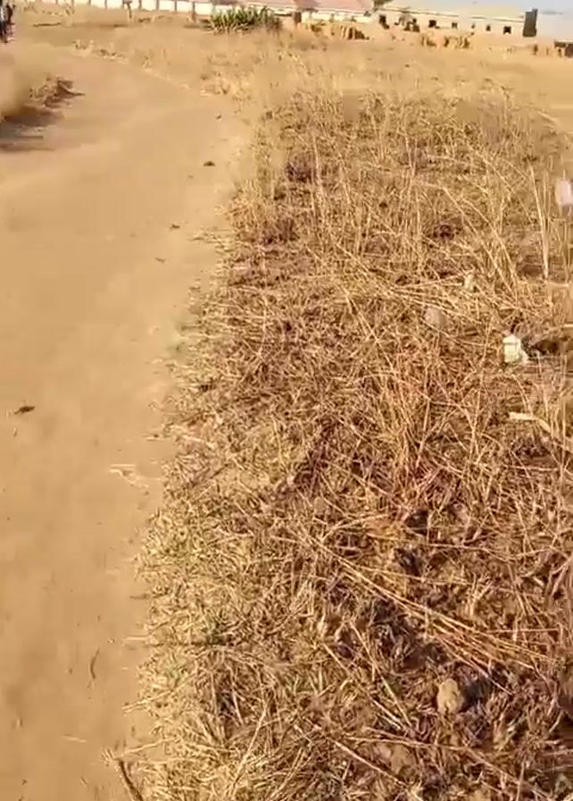 dusty dirt road running through a dry, grassy field. In the distance, a group of people can be seen walking along the road. There are buildings with red roofs in the background, as well as a cell phone tower. The sky is clear and the sun is shining. The camera is moving along the road, presumably following the group of people.