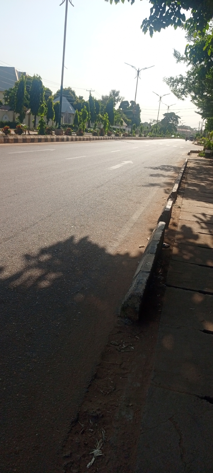 The image depicts a paved, multi-lane roadway in the city of Unknown, Unknown, viewed from a low angle on the right side of the street, looking forward. The roadway surface is dark asphalt with white painted lane markings, including a dashed line and a large white forward-pointing arrow in the foreground lane. A raised central median, lined with a dark gray curb, separates the traffic flow (unseen). This median features numerous tall, slender green trees and smaller flowering shrubs. Several tall, multi-armed streetlights are spaced along the median. To the immediate right of the foreground lane, a dark gray concrete curb separates the asphalt from a reddish-brown dirt strip, which then leads to a paved sidewalk made of rectangular concrete slabs. The sidewalk and dirt strip show signs of wear and dirt accumulation. Long, dark shadows from unseen foliage extend across the road and sidewalk, indicating bright, low-angle sunlight from the right side of the frame. In the background, beyond the median, other buildings with varying rooflines are partially visible through the trees, along with utility poles and overhead wires. The sky is bright and hazy, particularly towards the horizon. A single, dark vehicle, possibly a motorcycle, is faintly discernible in the far distance on the road. No individuals are clearly visible.