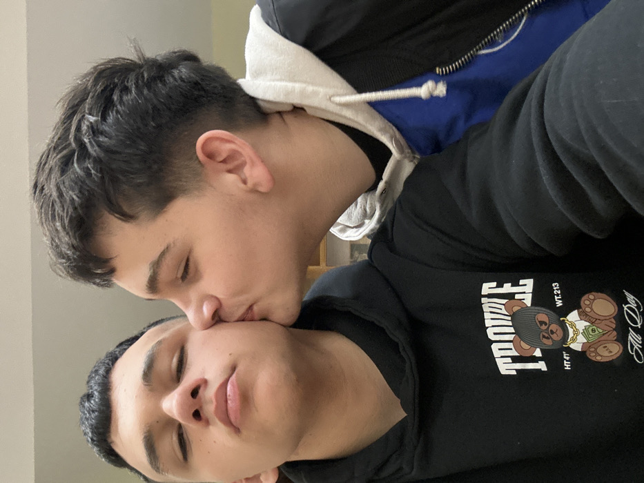 two young males engaged in an affectionate interaction indoors