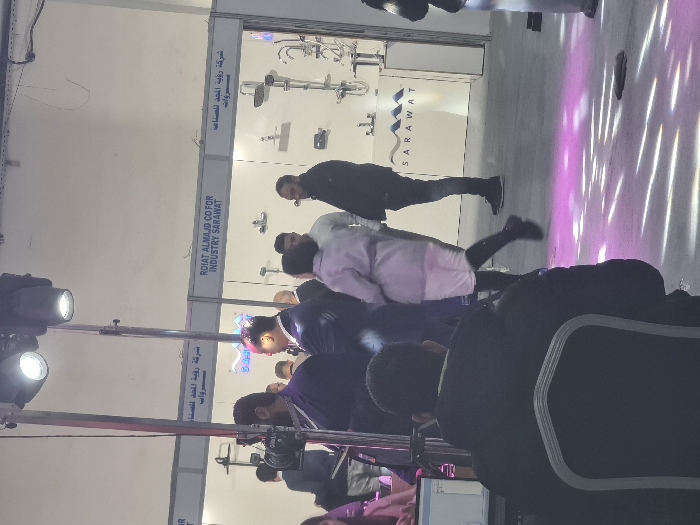 The image depicts an indoor event, consistent with a trade show or exhibition, in Shab'a, Syria. The environment features a light-colored floor, illuminated by patterned pink and white projected light, and a high ceiling from which two prominent stage lights are suspended from metal trusses. Multiple exhibition booths are visible. A central booth displays "ROIAT ALMAJD CO. FOR INDUSTRY SARAWAT" in both English and Arabic text, showcasing various silver-toned plumbing fixtures, including showerheads and faucets, mounted on white vertical panels. Another booth with "SARAWAT" text is partially visible to the left. At least ten individuals are present within the frame. In the immediate foreground, a person is seated with their back to the camera, wearing a dark jacket, positioned behind a visible white laptop screen. In the mid-ground, a female in a light-colored jacket, white pants, and dark boots walks towards the right. Several men in business or semi-casual attire, including dark suits and jackets, are standing and conversing or observing the displays. Among them are individuals with dark hair and beards. Other figures are visible in the background, near the booths, indicating a moderate crowd. A light stand or tripod is positioned in the mid-left area.
