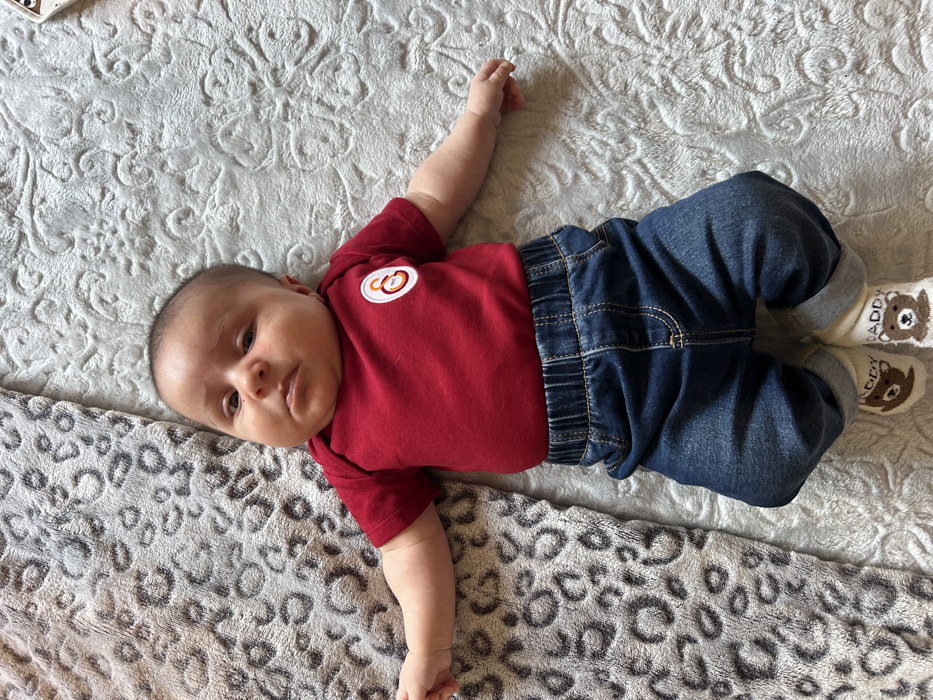 An infant is depicted lying on its back across two distinct blankets. The infant wears a short-sleeved red bodysuit with a white circular patch featuring an orange and brown intertwined 'GS' or similar symbol on the left chest. Dark blue denim-style pants with an elastic waistband cover the lower body. White socks, each adorned with "DADDY" text and a brown bear head graphic, are visible on the feet, which are slightly curled. The infant's arms are outstretched to the sides, and its head is positioned looking directly upwards with a neutral to slightly furrowed expression. The upper left portion of the frame shows a grey and black leopard print blanket. The majority of the background consists of a light grey blanket featuring an embossed floral or scroll pattern. The specific location within Frankfurt, Germany, cannot be identified from the visual content of the image.