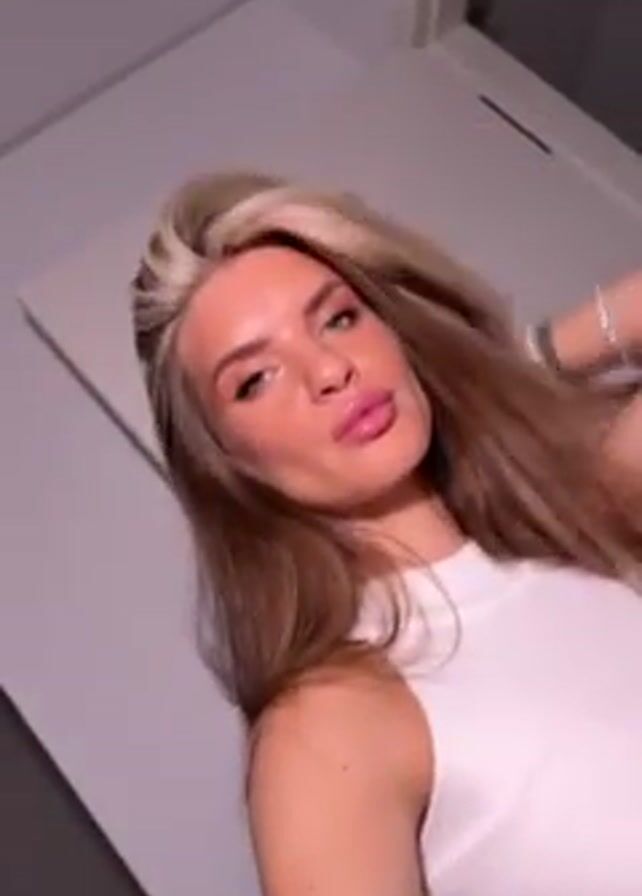 A light-skinned woman is posing in a low-angle shot selfie video, with a partially visible white door behind her. She's wearing a white ribbed tank top and has long blonde hair with brown roots. She's wearing bracelets on her left wrist. She touches her hair with her hand in the first few frames, then stops and poses with pursed lips.