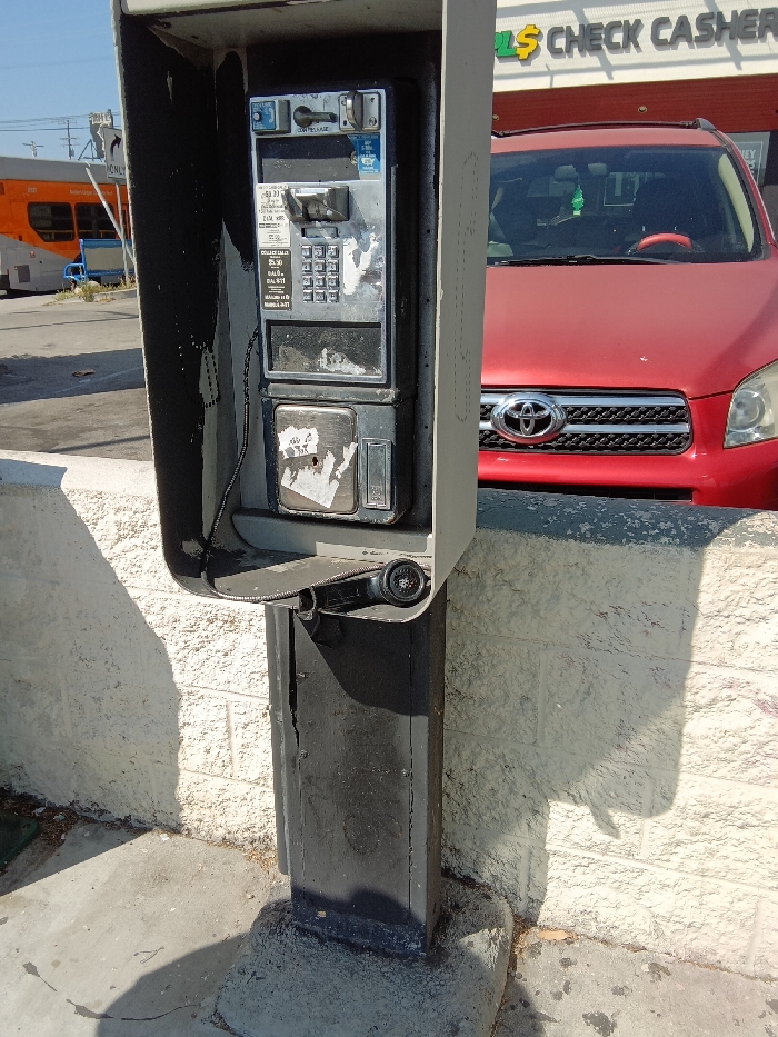- "The image depicts a public payphone located on a concrete sidewalk, adjacent to a low, light-colored block or stucco wall, in East Los Angeles, United States" by FM-7Rq8C3, licensed under CC BY 4.0