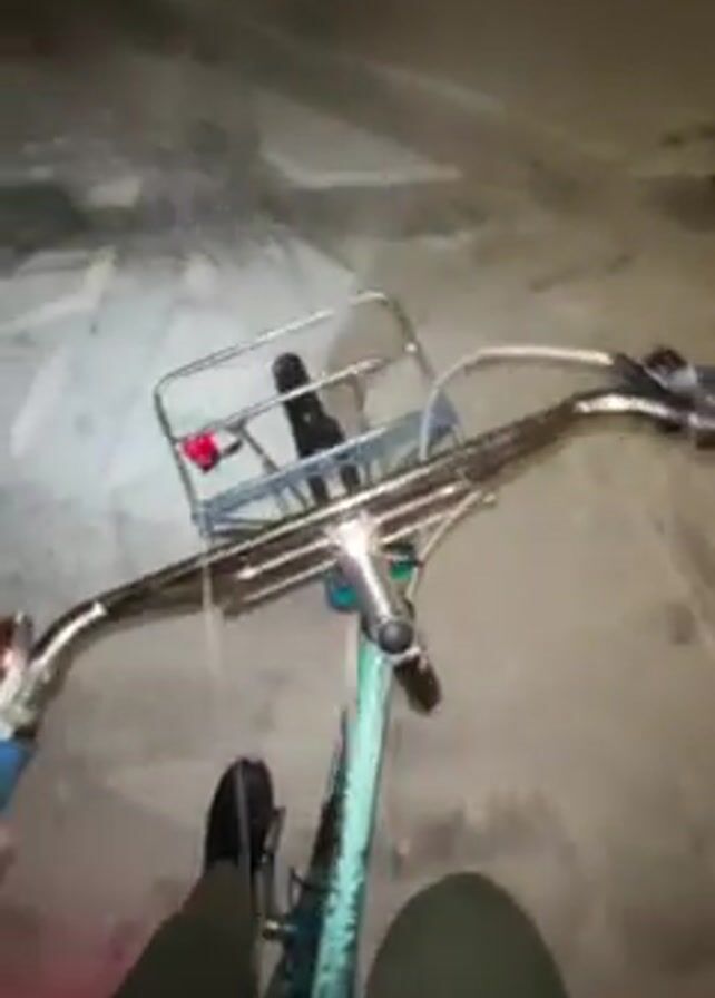 A first-person view shows a person riding a blue and white bicycle on a concrete surface