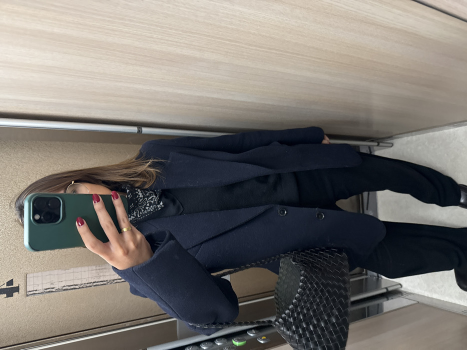 The image depicts an individual taking a mirror selfie inside an elevator in Madrid, Spain. The subject, a person with shoulder-length light brown hair, is seen from the chest down, with the face partially obscured by a dark green-cased smartphone held in the right hand. The person wears round, gold-rimmed glasses and has dark red nail polish on visible fingers, along with a gold-colored ring on the left ring finger. Clothing consists of a dark navy blue, two-button overcoat worn over a black long-sleeved top and black wide-legged trousers. A black and white paisley-patterned bandana is tied around the neck. A black woven leather shoulder bag with a braided strap is held in the left hand. The elevator interior features reflective surfaces, with a light wood-grain panel visible on the right and a silver control panel with green illuminated buttons on the left. The floor is a light, neutral color. A faint black mark resembling the number "4" is visible on the upper left reflected wall.