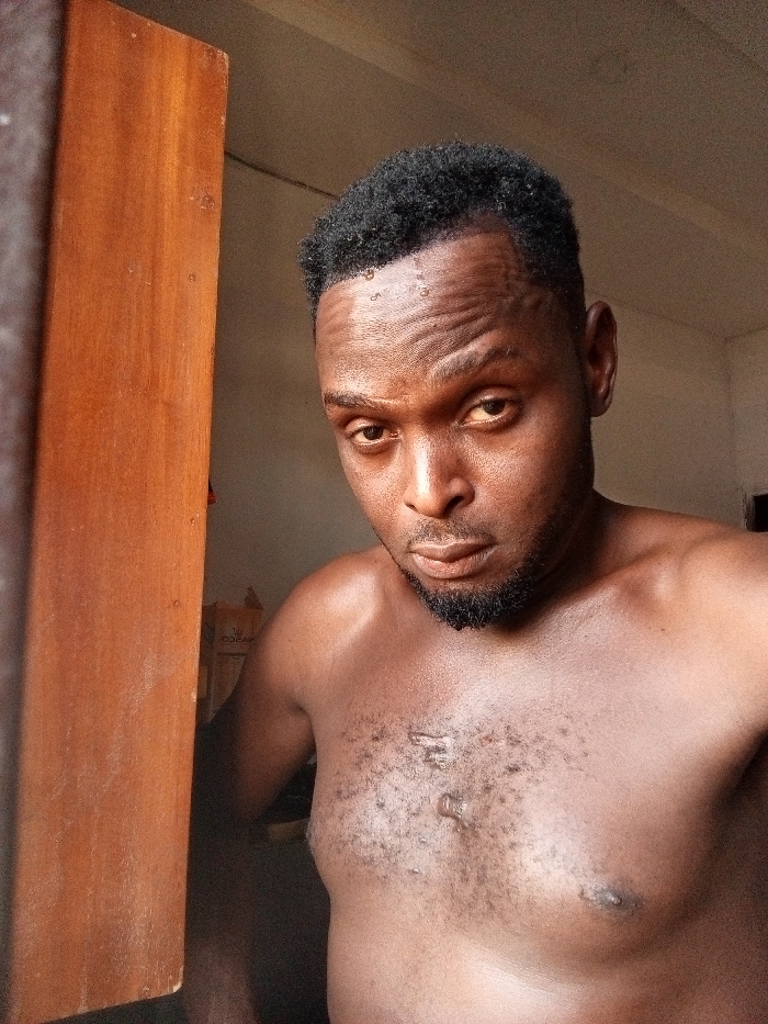 A shirtless man with dark skin and short, curly black hair poses indoors. He has a trimmed beard and a serious expression. Light reflects on his forehead and chest, highlighting the texture of his skin and hair. A wooden door frame is visible to the left, with soft light illuminating the background walls and objects. The overall image has a casual, personal feel.