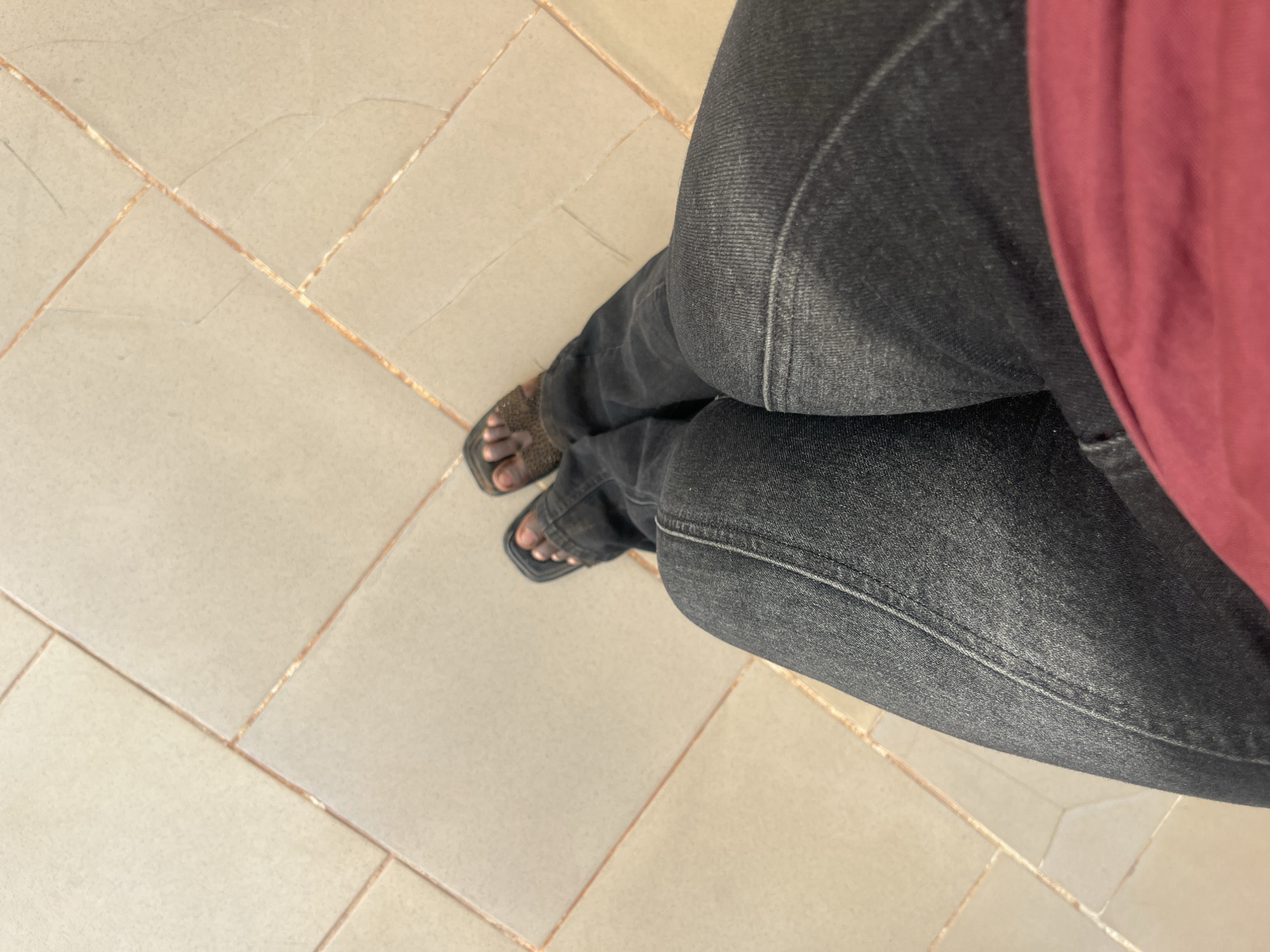 A person wearing black denim jeans and brown sandals is sitting on a tiled floor. A portion of a maroon shirt is visible on the right side of the frame. The scene is in a location with a tiled floor, potentially indoors, but there are no other distinct markers that would allow me to pinpoint the specific city of Rido, Nigeria.