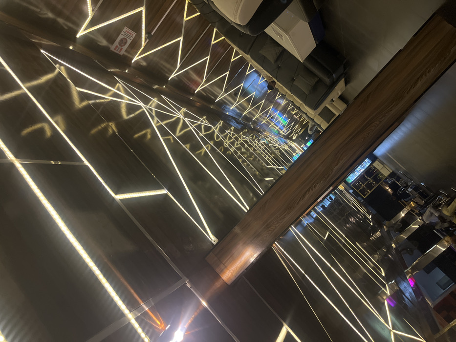The image depicts the interior of a modern commercial establishment, likely a lounge or restaurant, located in Barden Yana, Nigeria. The scene is illuminated by numerous white LED strip lights arranged in geometric, linear patterns across dark, reflective ceiling and wall panels, creating an illusion of depth and infinite reflections. A large, rectangular pillar with a medium-brown wood grain finish extends diagonally from the upper left to the lower right of the frame, dominating the foreground. On the right side of the image, multiple black and lighter-colored upholstered sectional couches are arranged along a wall, forming seating areas. Small, white, cuboid tables are positioned next to some of these seating units. One individual is partially visible sitting on a couch on the right, wearing a light-colored top. In the upper right quadrant, a red and white "NO SMOKING" sign is affixed to a wall panel. In the mid-ground and background on the left, additional seating and what appears to be a bar or counter area with bottles are faintly visible. Several indistinct figures, mostly adults in light-colored shirts and trousers, are observed seated or standing in this area. No specific actions or interactions are clearly discernible. The floor is dark and reflective. An intense orange-red light source or reflection is present on the far left side of the ceiling. The overall environment presents a sleek, contemporary aesthetic.