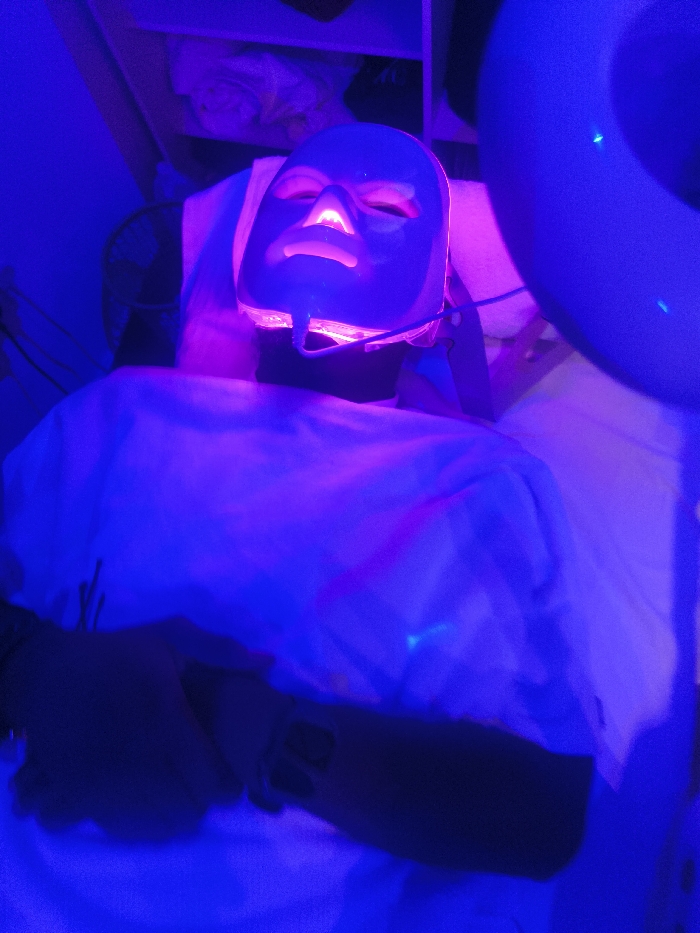 - "A person lies down wearing an illuminated LED facial mask, emitting a bright blue and pink glow" by FM-2Sf3M2, licensed under CC BY 4.0