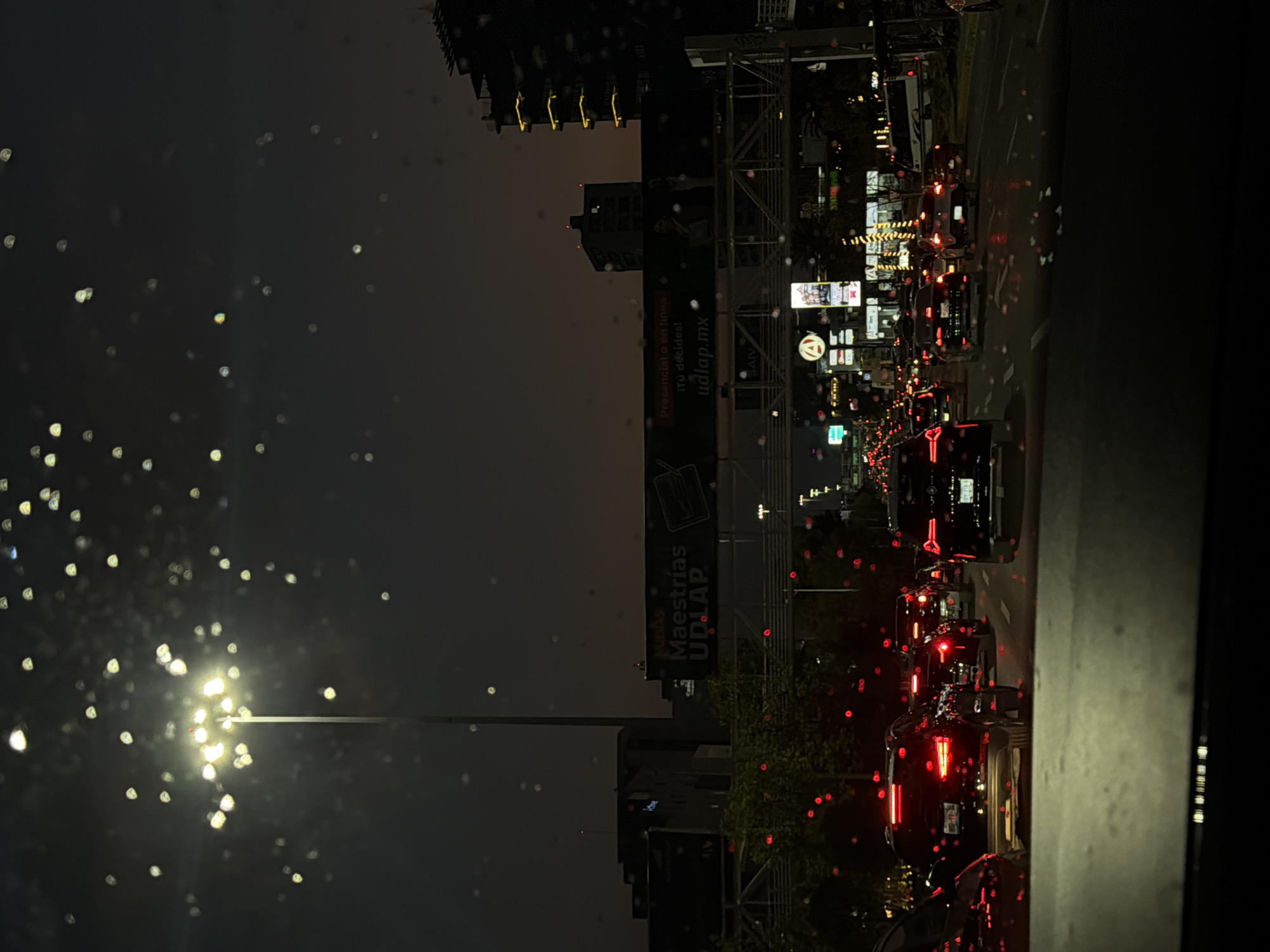 The image captures a nighttime urban traffic scene in San Bernardino Tlaxcalancingo, Mexico, viewed from the interior of a vehicle through a windshield covered in moisture droplets. The foreground reveals the top edge of a dark dashboard. Numerous bright, out-of-focus light sources (bokeh) are scattered across the upper two-thirds of the frame, indicative of light refracting through water on the glass. The central focus is a multi-lane roadway filled with a queue of vehicles, primarily cars and SUVs, distinguished by their illuminated red taillights extending into the distance. Vehicles appear stationary or are moving slowly. A bright white streetlight on a tall pole is prominent on the upper left. Above the roadway, a large horizontal billboard displays the text "Maestrías UDLAP" and "Presencial o en línea ¡Tú decides! udlap.mx" against a dark background, supported by a metal truss structure that also serves as a pedestrian overpass. Behind the billboard and bridge, multiple multi-story buildings are visible, including a dark structure on the far right with illuminated yellow horizontal bands on its upper floors. Other commercial signage and distant city lights are discernible. The sky is dark, consistent with a nighttime setting. No specific individuals are identifiable within the frame.