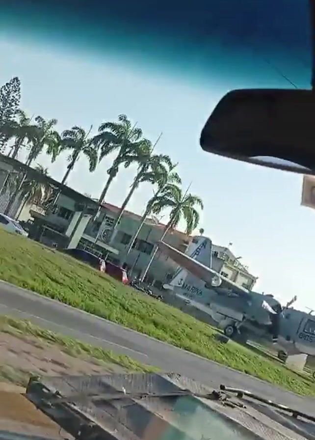 view from inside a vehicle, likely a truck or large service vehicle, driving along a road. The road is paved and lined with street lights and trees, some of which appear to be palm trees. In the first few seconds, a fixed-wing aircraft can be seen parked on the grass beside the road. The driver is visible operating the vehicle. A dashcam is mounted on the front windshield. The weather appears sunny and clear.