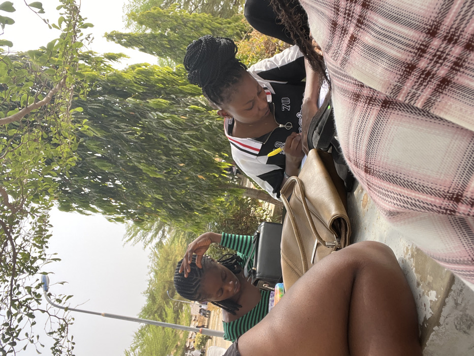 The scene depicts three individuals, presumably students, engaged in an outdoor study session in Nassarawa, Nigeria. In the foreground, a brown, leather-like handbag rests on a light-colored, possibly concrete surface. To the left, a female individual with dark skin and braided hair, wearing a green and black striped long-sleeved shirt, is seated with her head slightly bowed, her left hand touching her head. A black handbag is positioned to her right. Centrally, another female individual with dark skin and braided hair, styled in a bun, is seated. She wears a black, white, and red zipped top featuring the number "70". She is actively writing in a white notebook with a yellow pen. Partially visible on the far right is the shoulder and back of a third individual, wearing a pink and white plaid shirt. The background features a bright, overcast sky and abundant green foliage from various trees, including tall, slender evergreens and broader-leafed deciduous trees. A street light post is visible on the far left, and faint figures or structures are discernible in the distant background. The overall impression is one of focused academic activity in a natural, open-air environment.