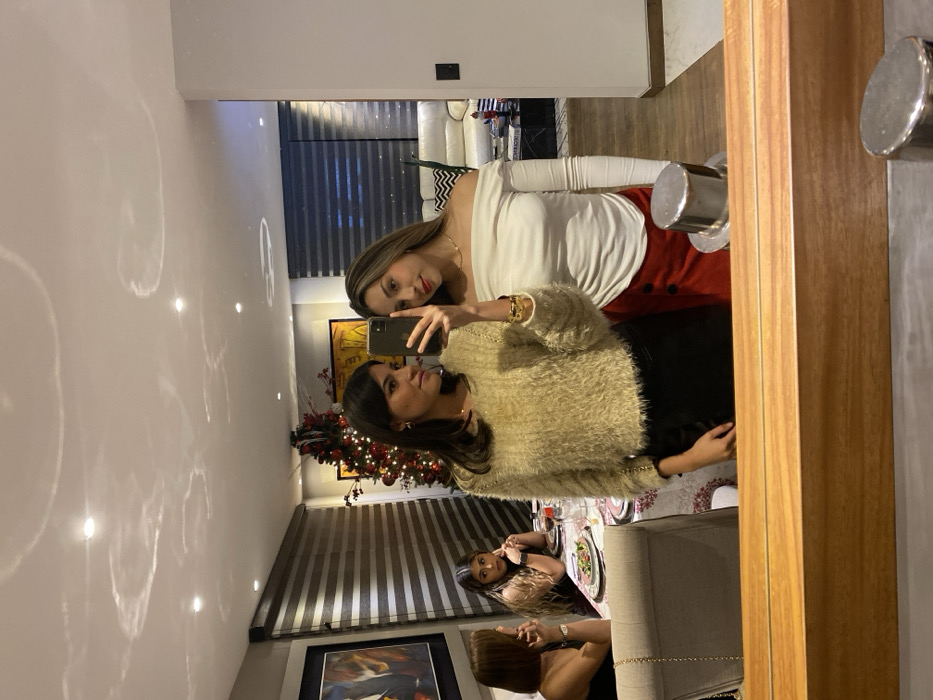 Two women pose in a mirror selfie. One wears a fuzzy tan sweater, the other a white top and red skirt. A Christmas tree glows behind them. A dining table with place settings is partially visible. The reflection shows two more women at the table. Artwork adorns the walls. The mirror has a wood frame and a silver handle. Ceiling lights illuminate the scene.