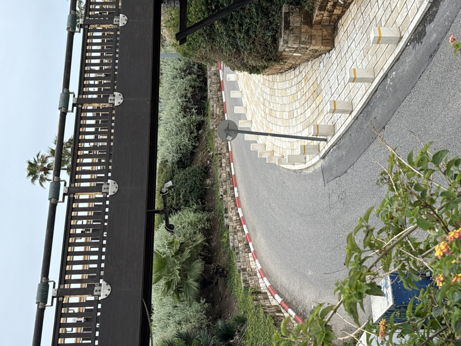 The image displays an outdoor scene in Tel-Aviv, Israel, depicting a curved road and a paved pathway situated beneath a pedestrian bridge, consistent with the area near the Reading Promenade. A dark-colored, possibly dark brown or black, wooden or wood-paneled pedestrian bridge spans horizontally across the upper third of the image. The bridge features vertical slats and horizontal top rails, with various metal brackets securing components. Attached to the underside of the bridge is a dark metal arm supporting two surveillance cameras, one white and one dark, both angled downwards towards the ground. Below the bridge, a narrow, asphalt road curves sharply to the right. Its left edge is defined by a stone retaining wall and a curb marked with alternating red and white stripes. Adjacent to the road on the right, a lighter-colored paved pathway, constructed of square pavers laid in a fanned pattern, follows the road's curve. This pathway is bordered by a series of light-colored, square-profile bollards, each equipped with a yellow reflective strip at its top. A thin, dark metal post with a circular, dark sign stands between the road and the paved pathway. The environment features abundant vegetation. Dense, grey-green shrubbery covers the slopes above the stone retaining walls on both sides of the road. Several palm trees are visible against an overcast, light grey sky in the background, with one prominent palm tree positioned to the left of the bridge. In the lower-left foreground, a leafy branch with green foliage and small yellow-orange flowers extends into the frame, partially obscuring a blue utility box. No individuals or vehicles are present in the depicted scene.