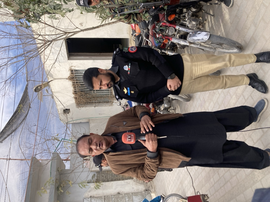 An outdoor scene in Quetta City Tehsil, Pakistan, depicts three men on a paved surface in front of a light-colored building. In the foreground, a man with dark hair, wearing a brown jacket over a black shalwar kameez, holds a red and white "TV TODAY" microphone in his right hand and gestures with his left. To his right stands a police officer with a dark beard, wearing a dark blue ribbed uniform top with badges and a Pakistani flag patch, khaki pants, and black shoes. His hands are clasped in front. Further to the right, partially visible, is a security personnel wearing camouflage fatigues, a black "POLICE" cap, and carrying a rifle. Behind the individuals, several motorcycles are parked. The background features a white building with a barred window overgrown with dry vines and an open doorway. A number "46" is visible on the wall. Overhead, a dark net-like covering is strung, and bare tree branches are scattered across the frame. The ground is paved with light-colored interlocking bricks under a bright, clear sky.