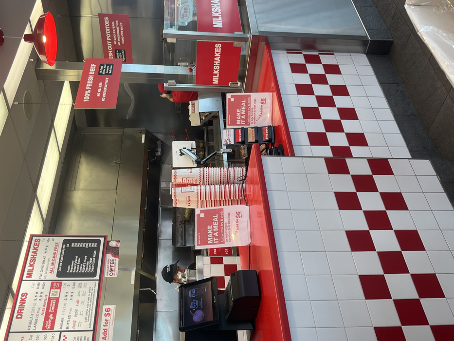 This image depicts the interior of a Five Guys Burgers and Fries restaurant located in El Paso, United States